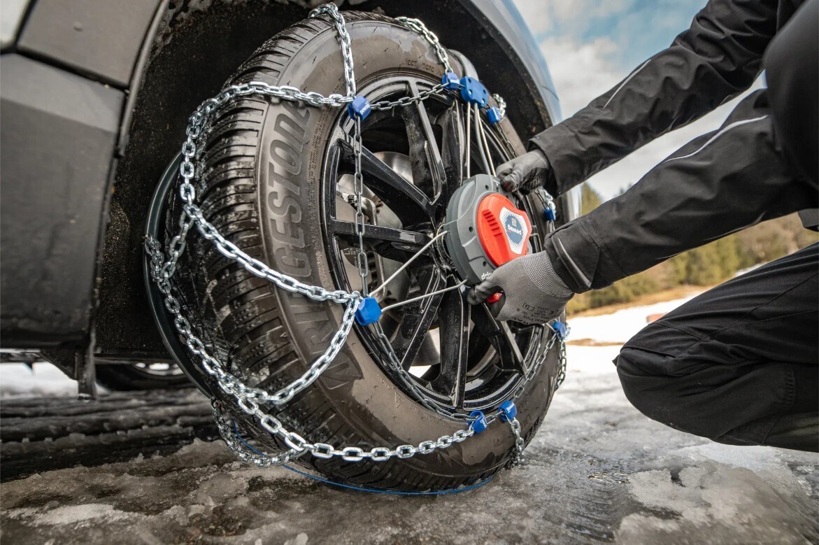 Inovativní sněhový řetěz s řetězovou sítí z článků starwave® a s pevným kruhem. Vyvinut speciálně i pro automobily se zadním náhonem
