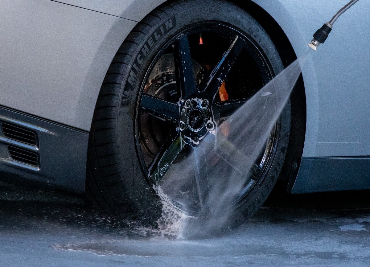 • Opláchněte čistič z povrchu kol silným proudem vody.